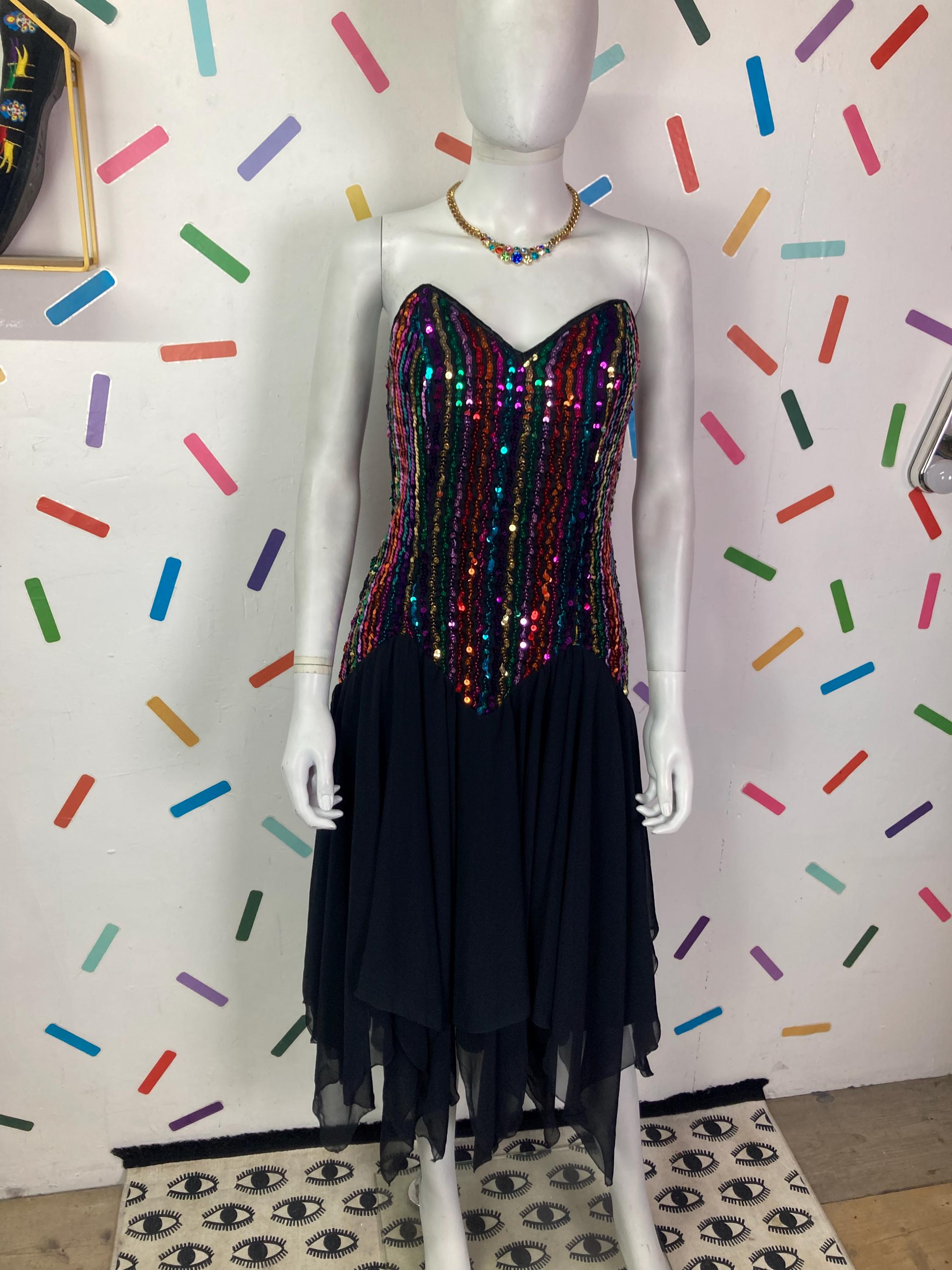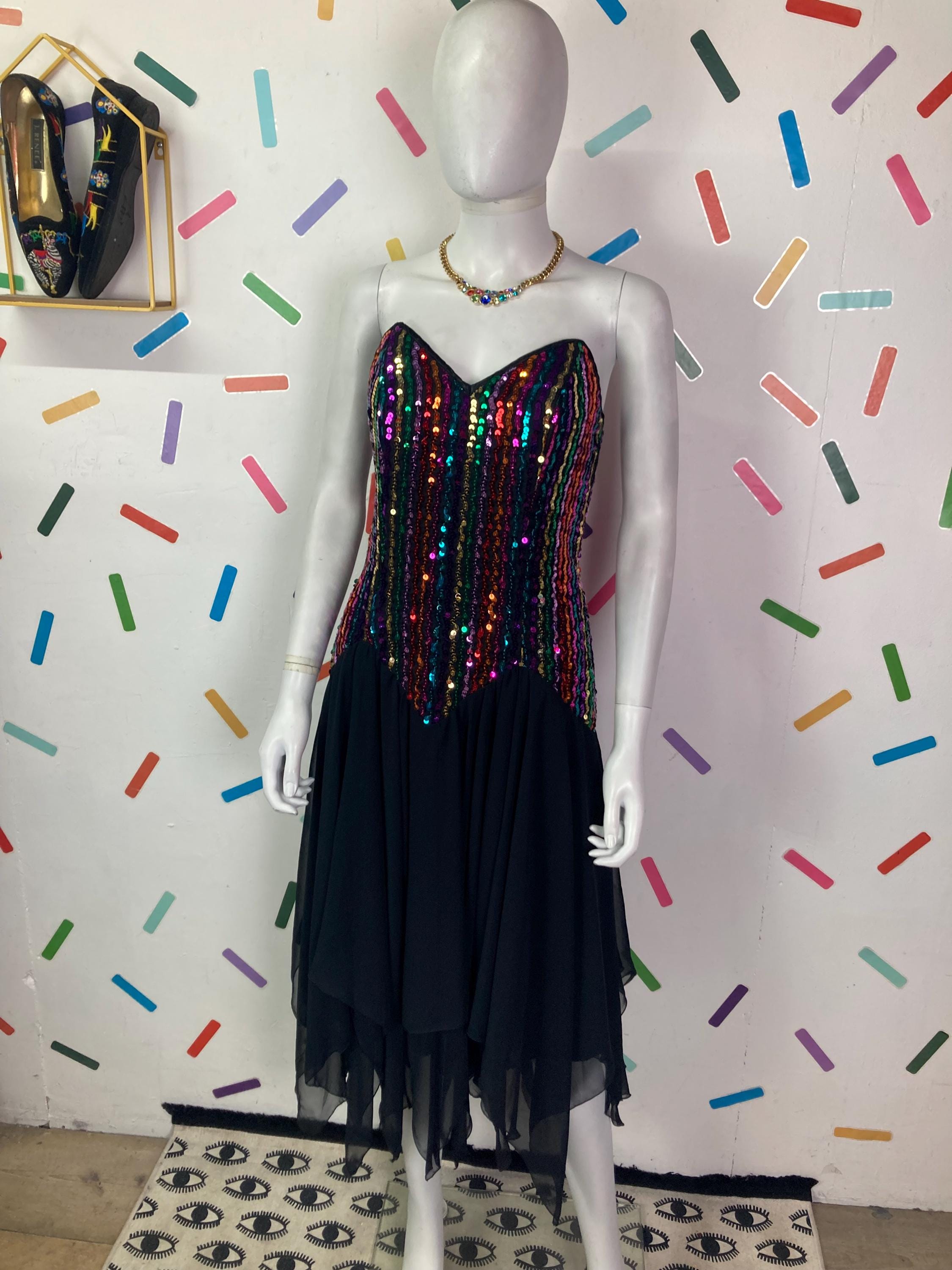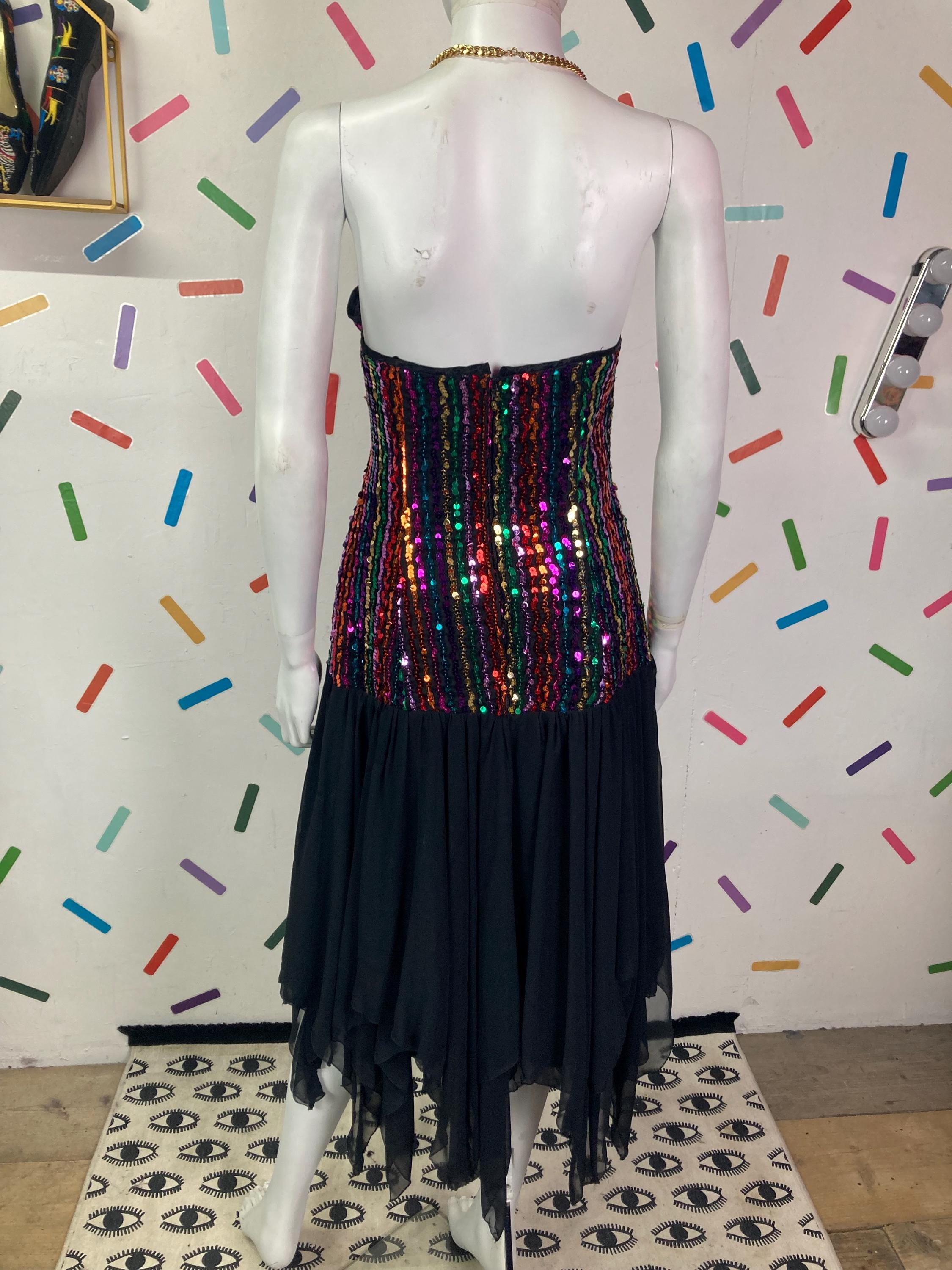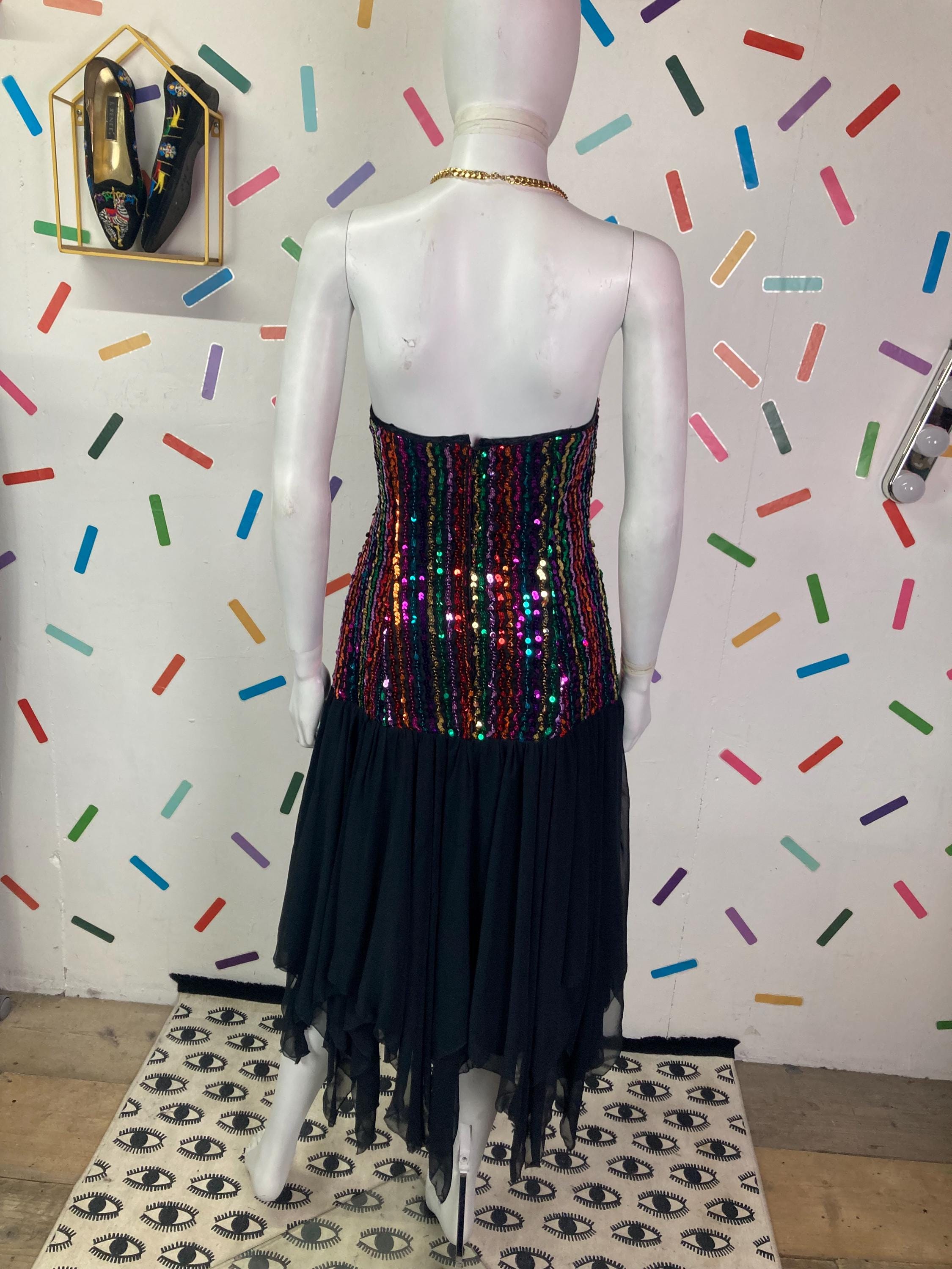 Other: This is a great 80s sequined dress with bodice design and handkerchief skirt design. Zip back fastening.