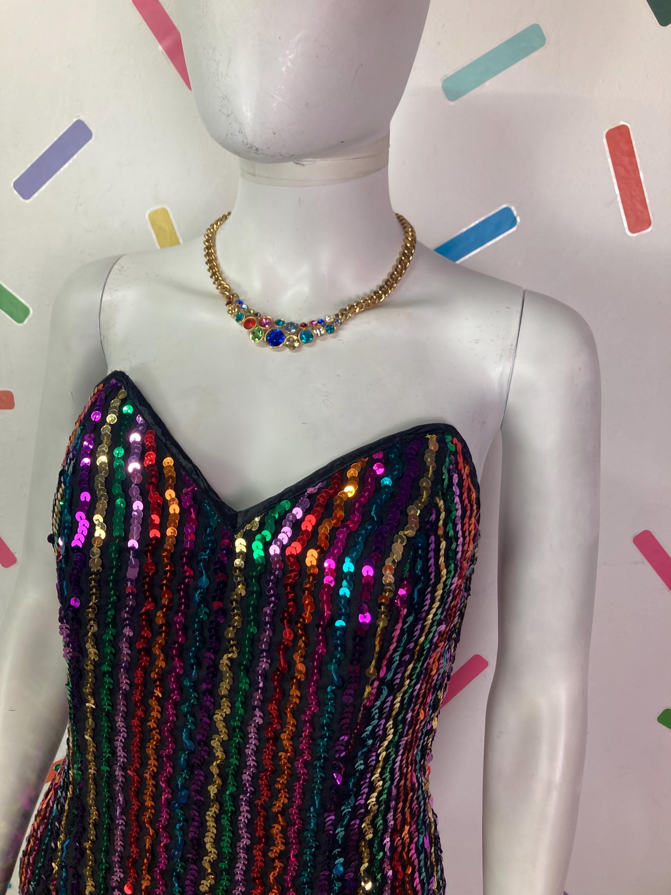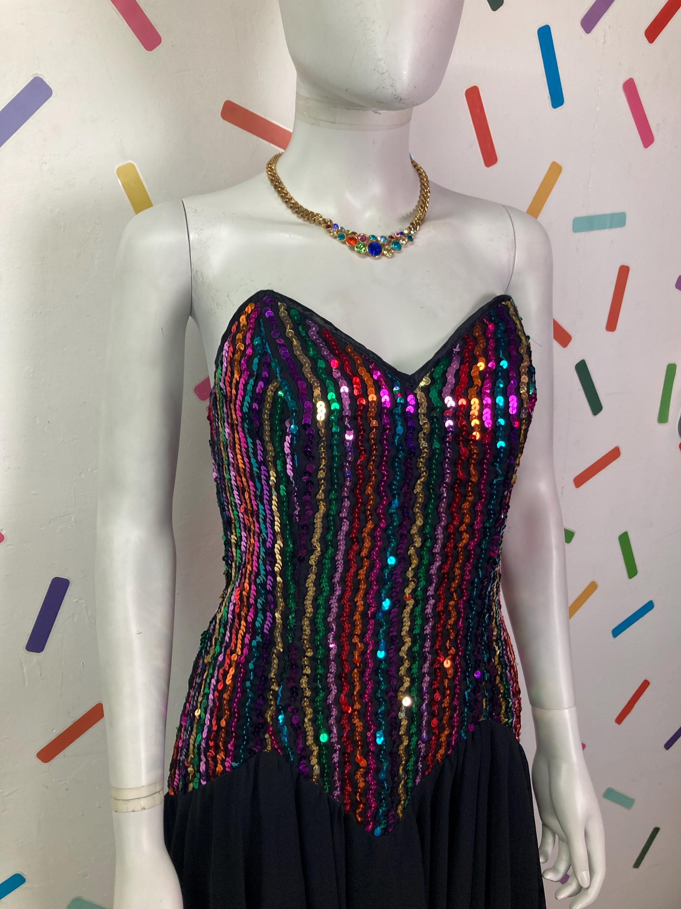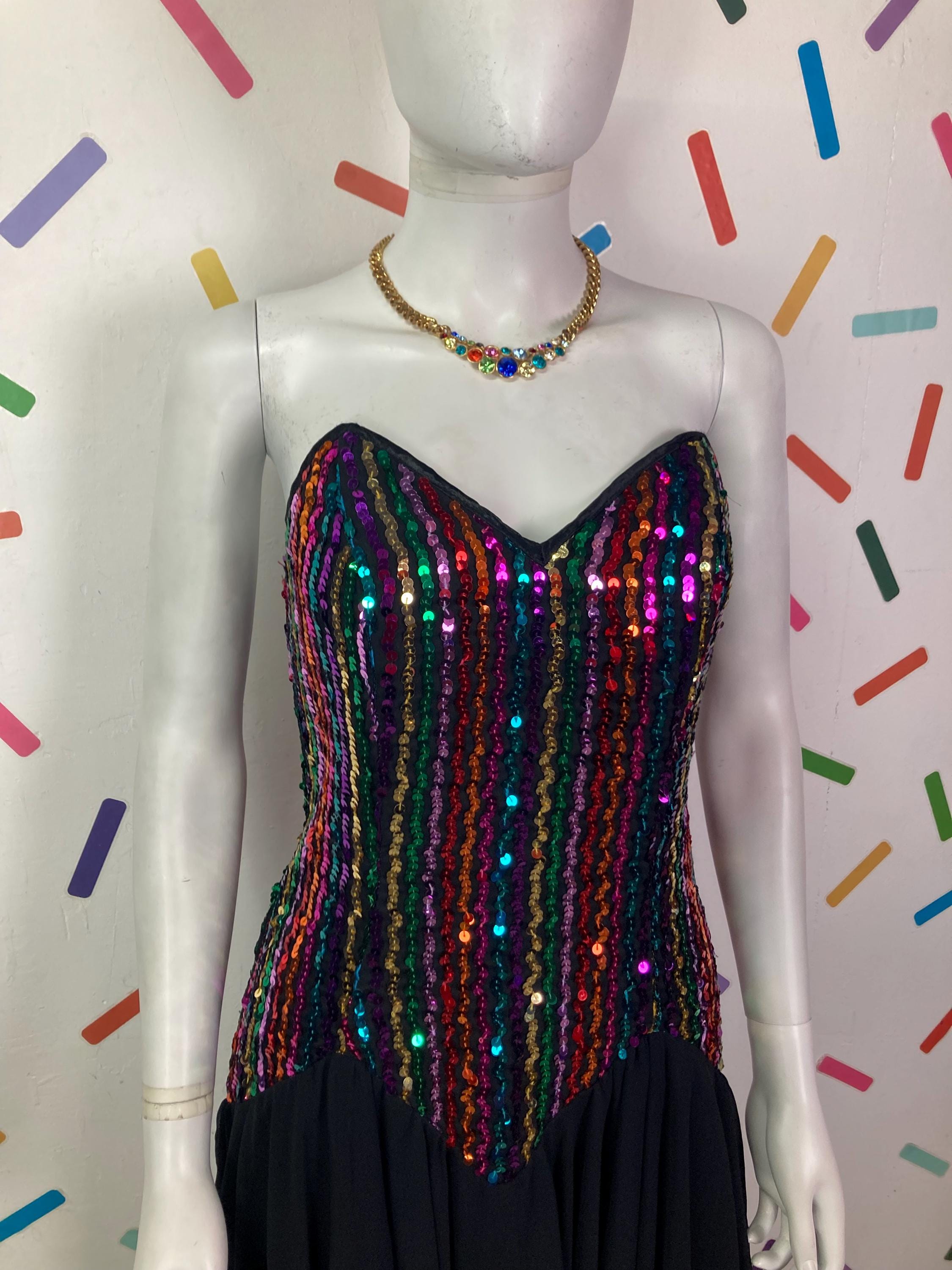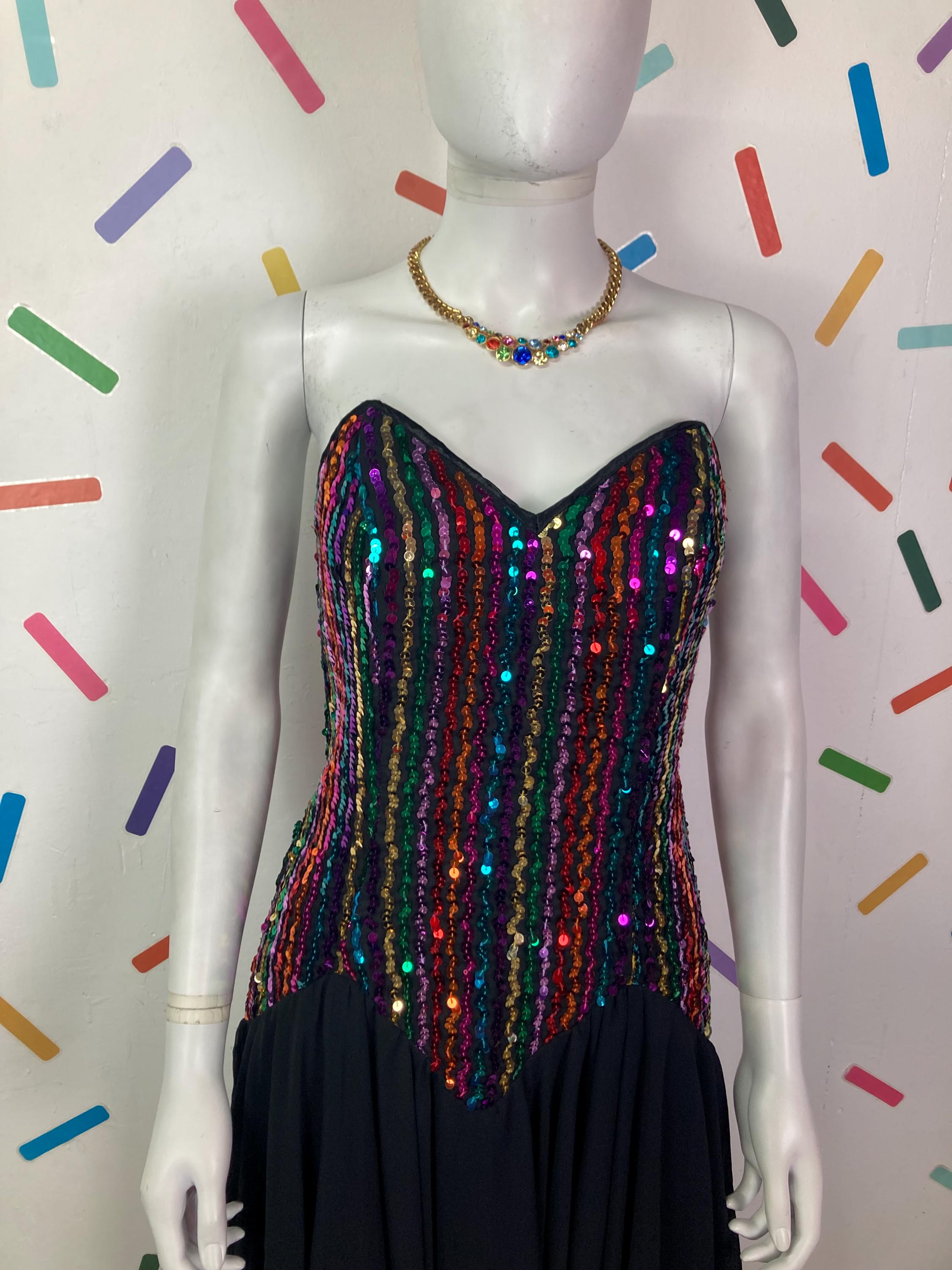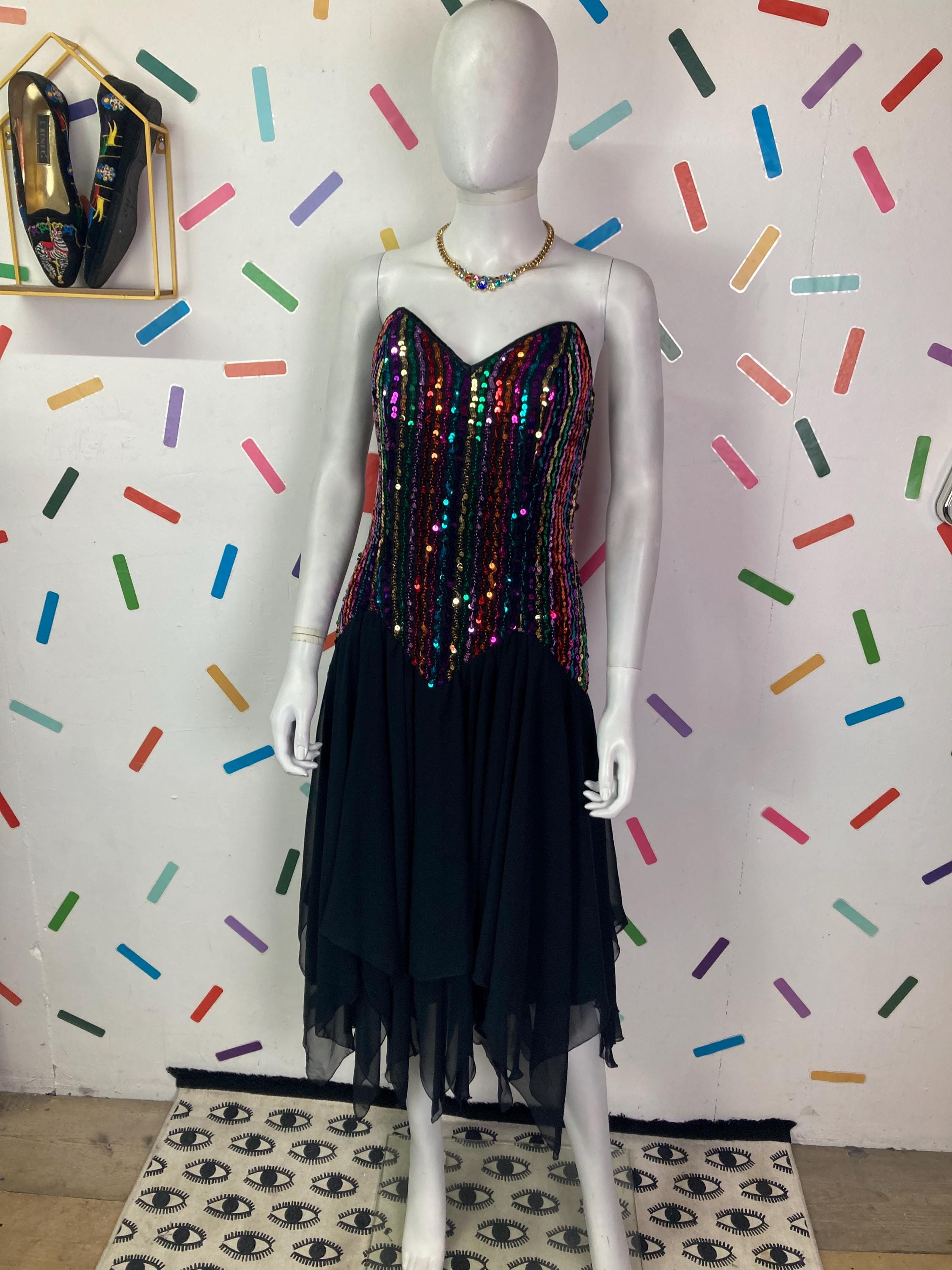 Other: This is a great 80s sequined dress with bodice design and handkerchief skirt design. Zip back fastening.