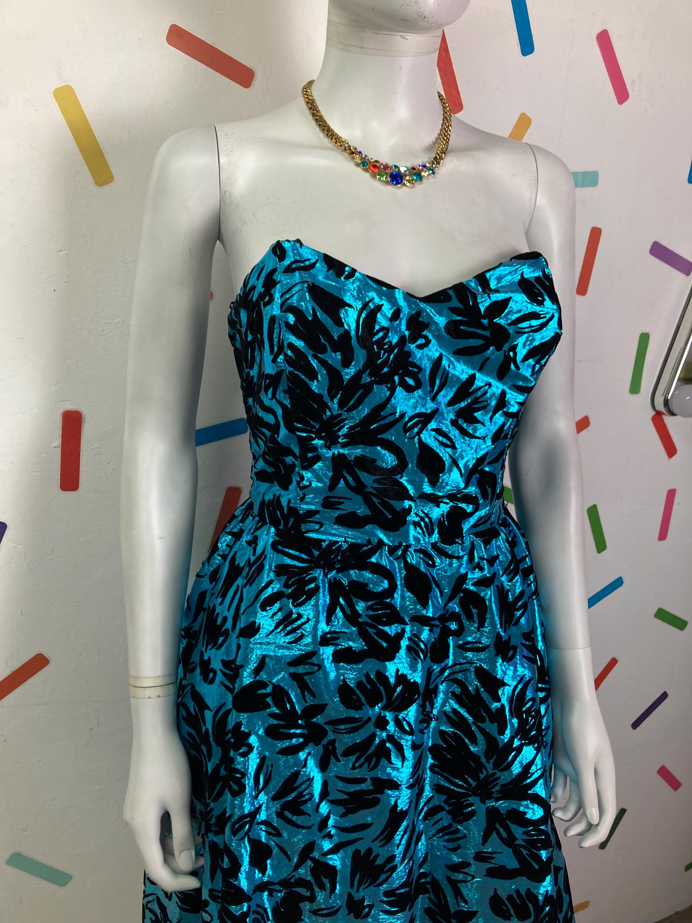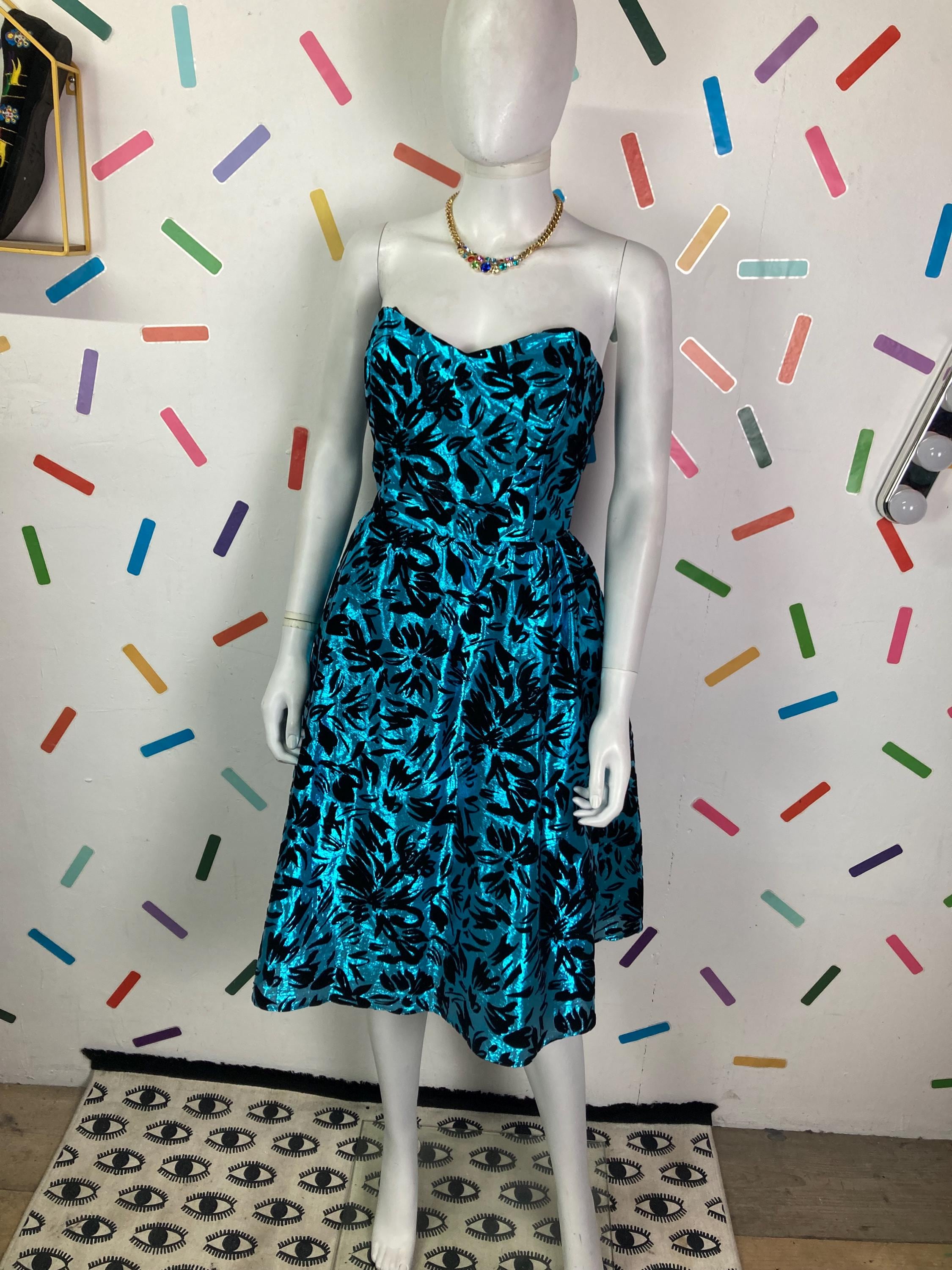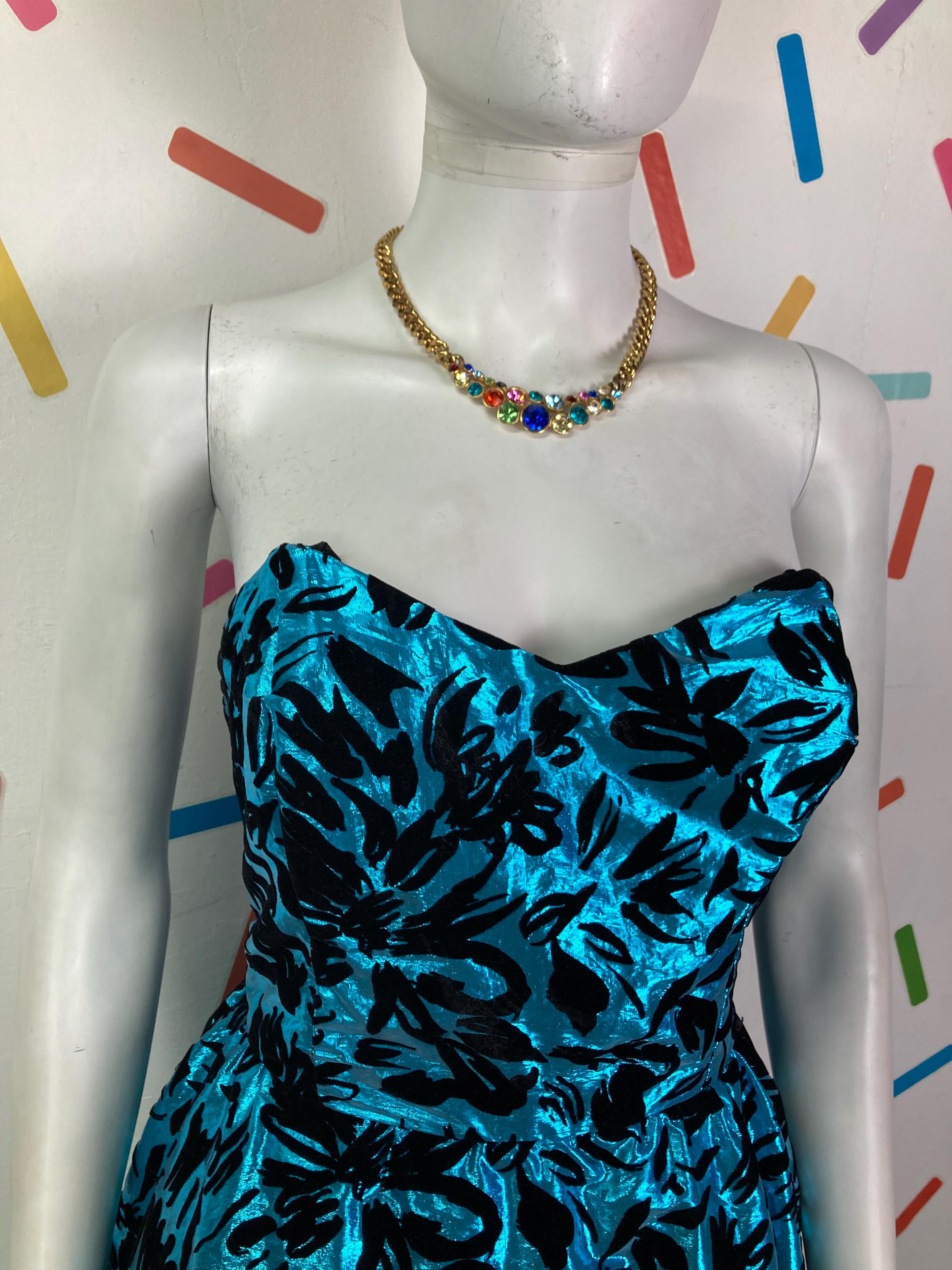 Other: This is a great 80s blue and black lame dress with velvet details. Zip back fastening.