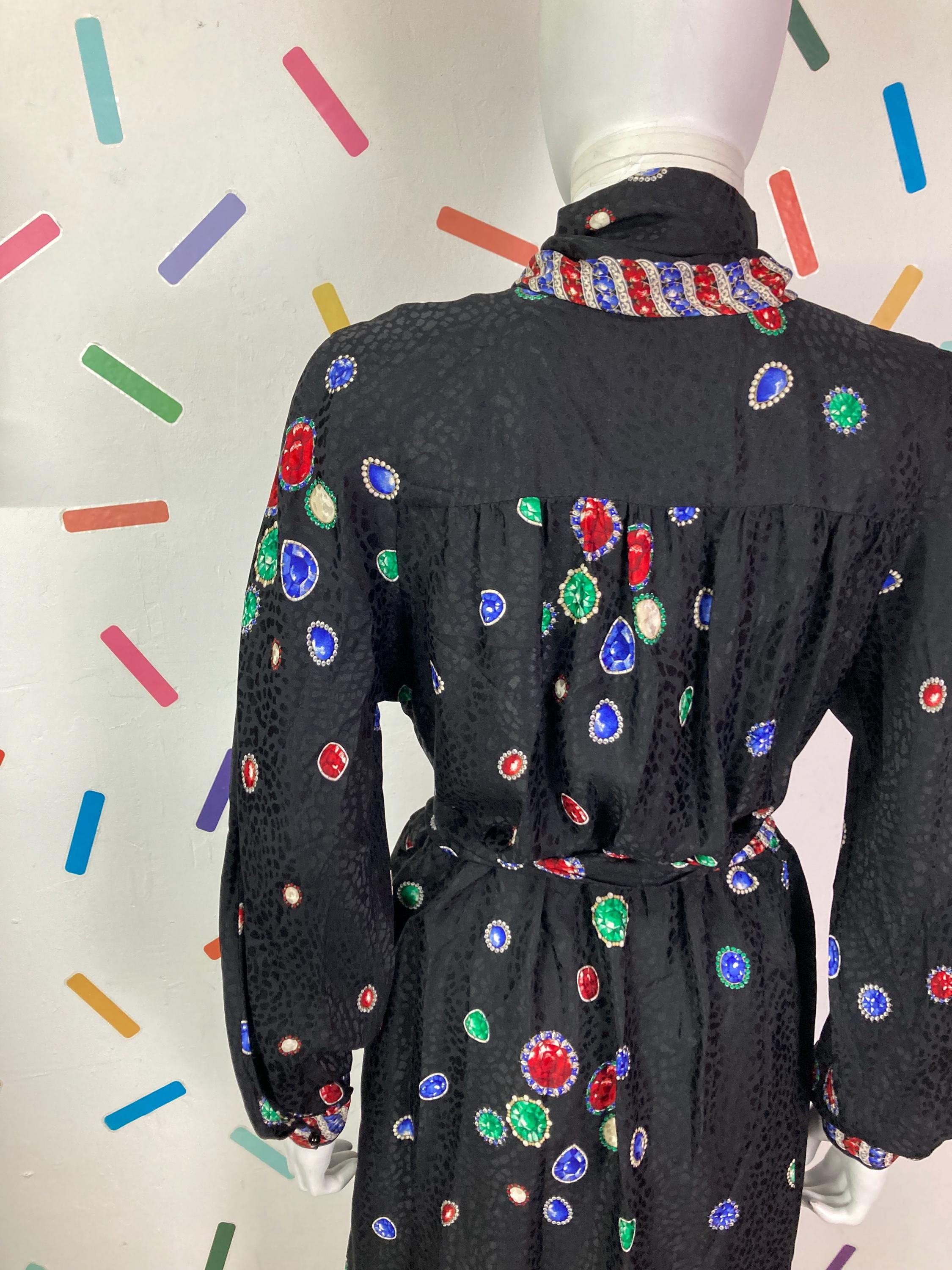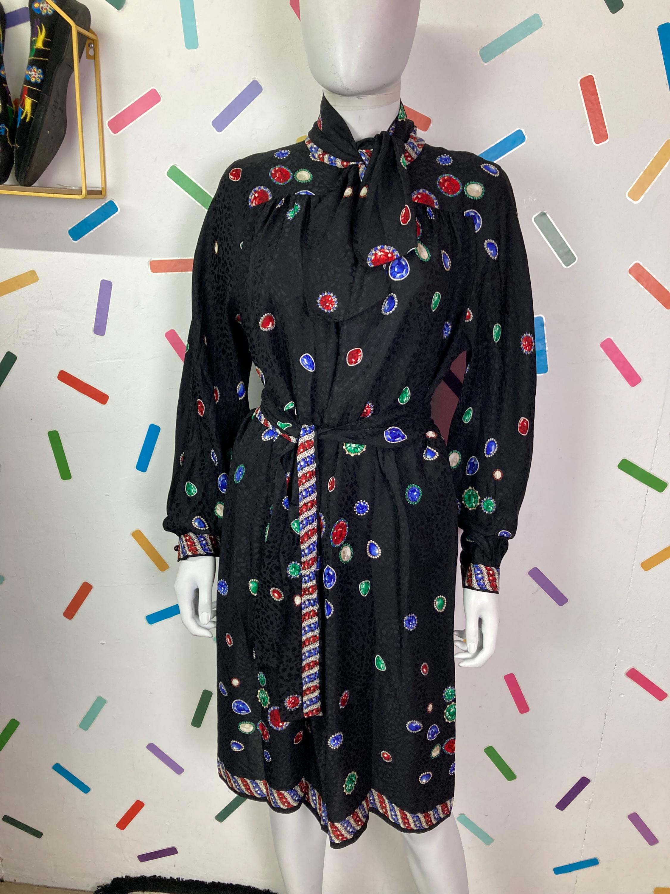 Other: This is a fabulous 80s long sleeve jewel design dress with intergral belt and pussy bow.