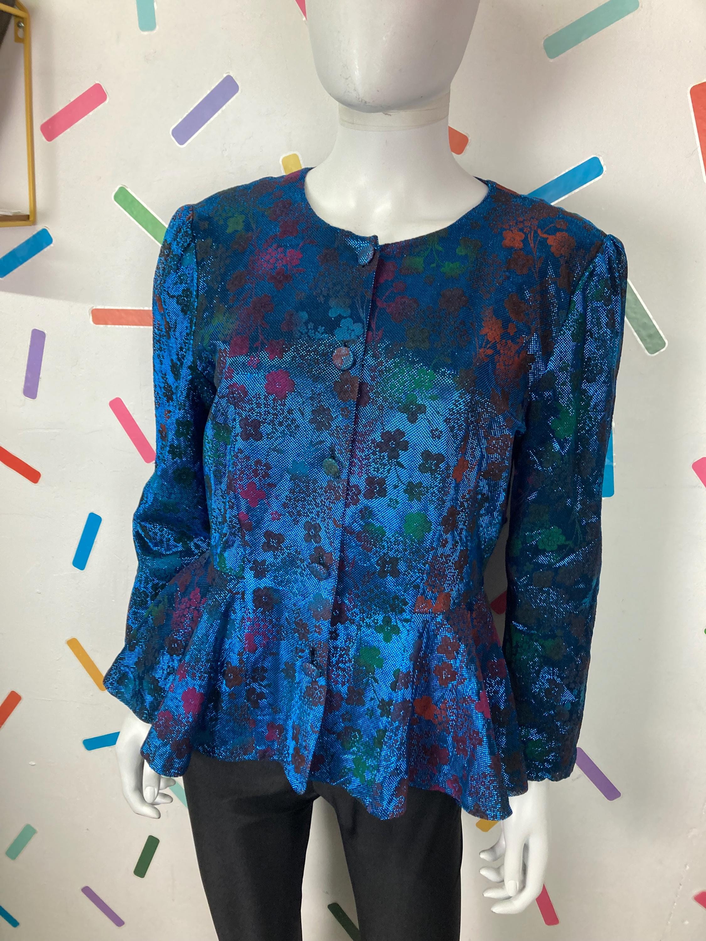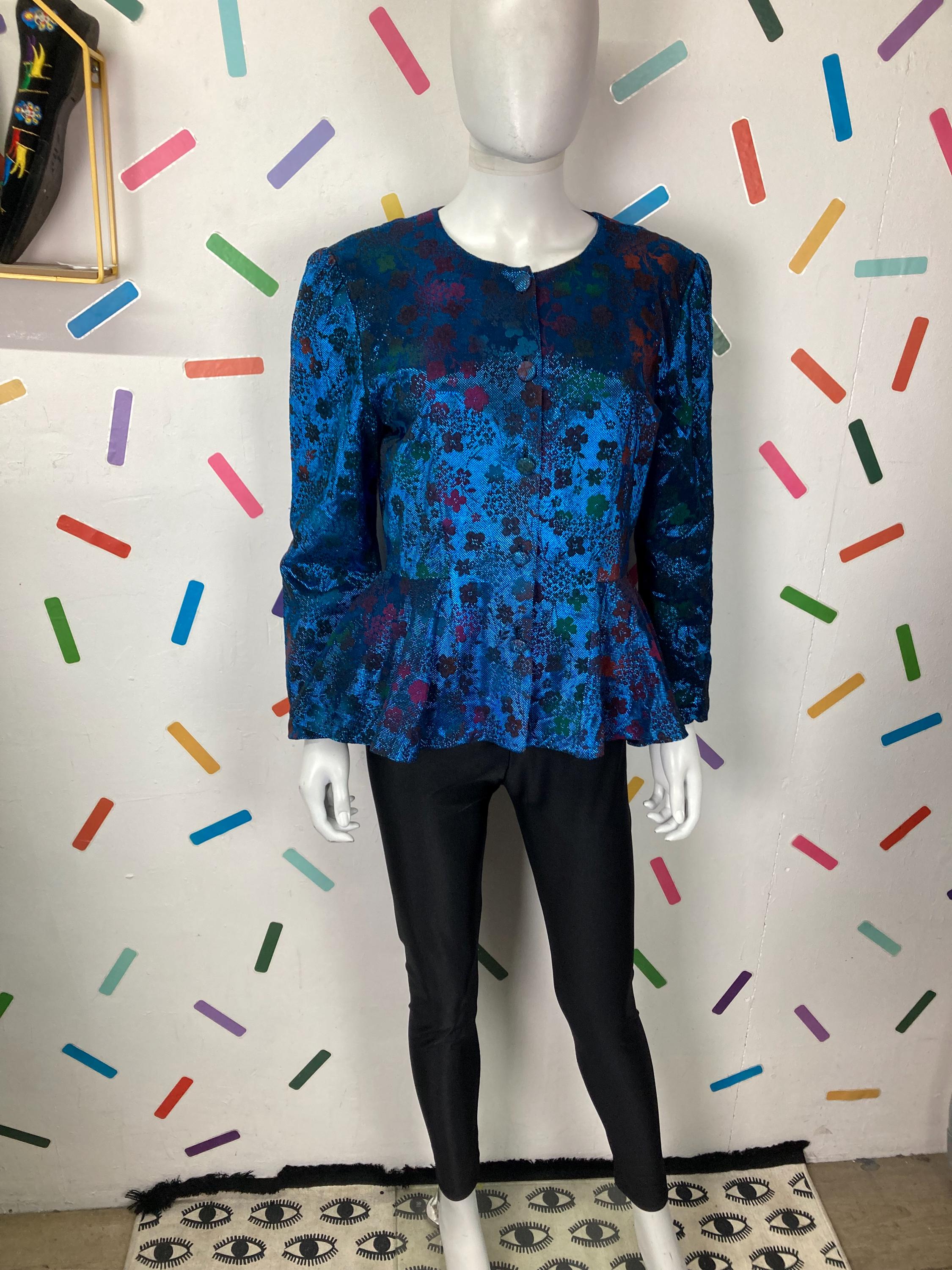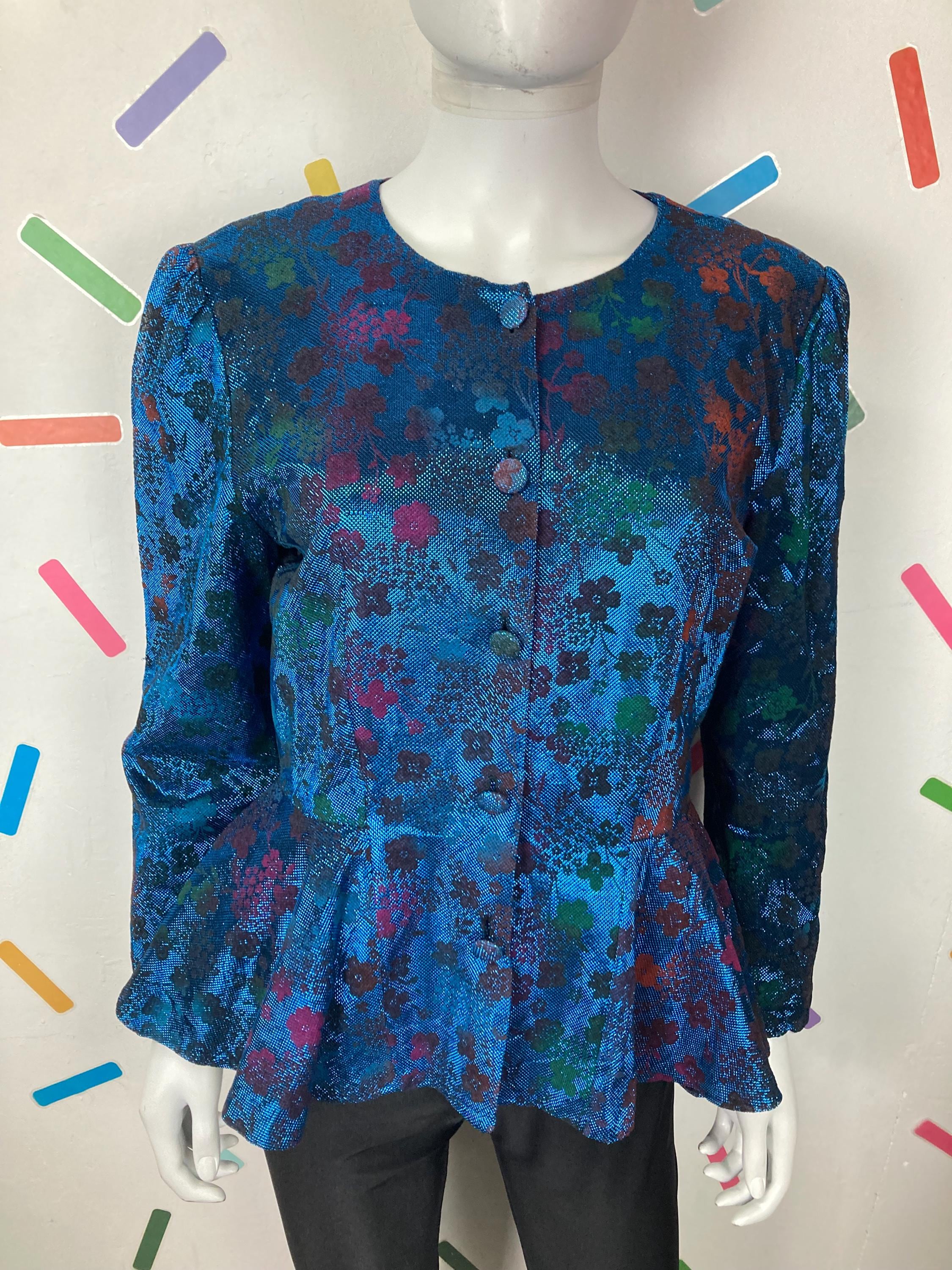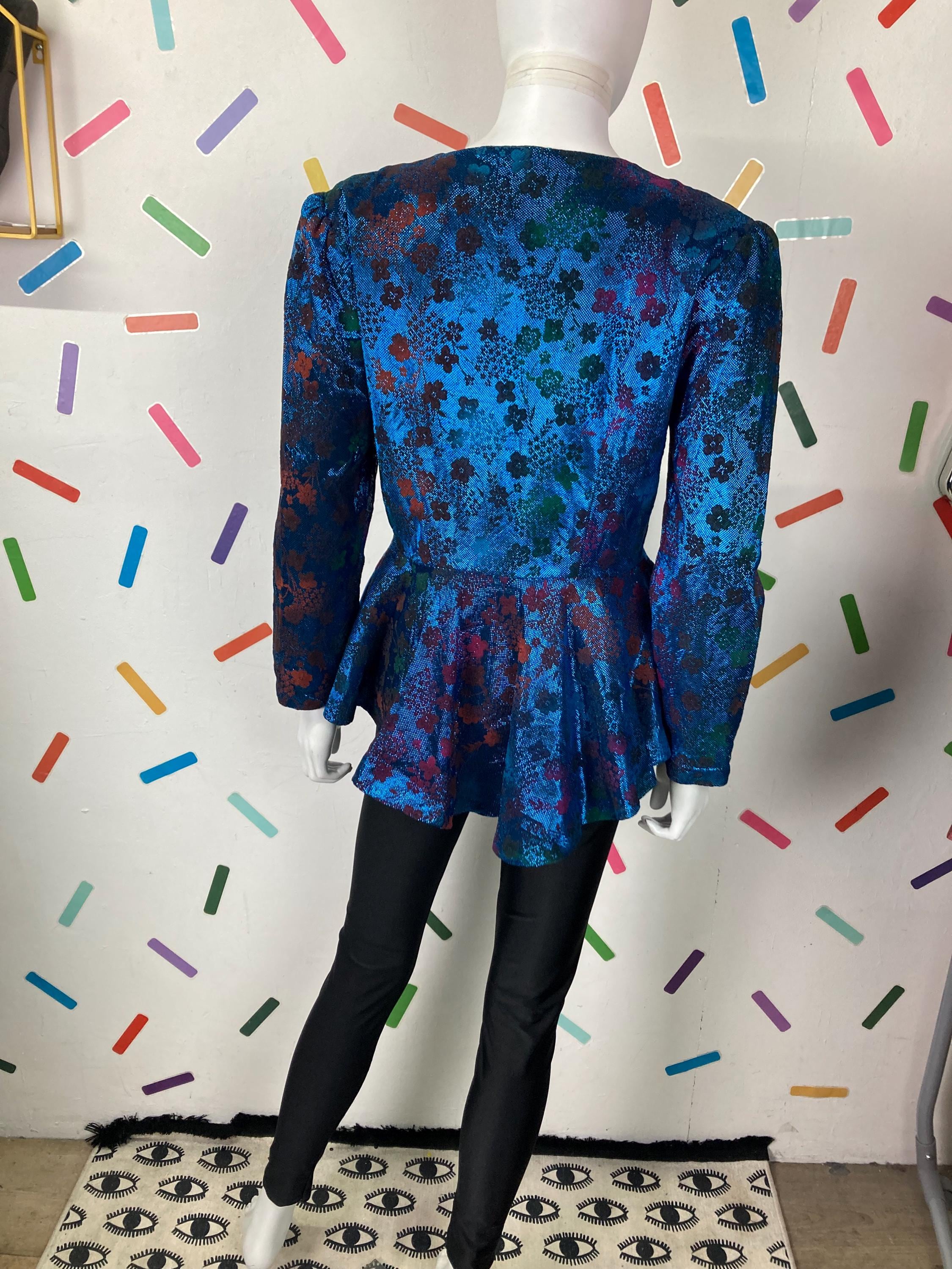 Other: This is a fabulous 80s blue lightweight metallic floral design peplum top with button fastening.