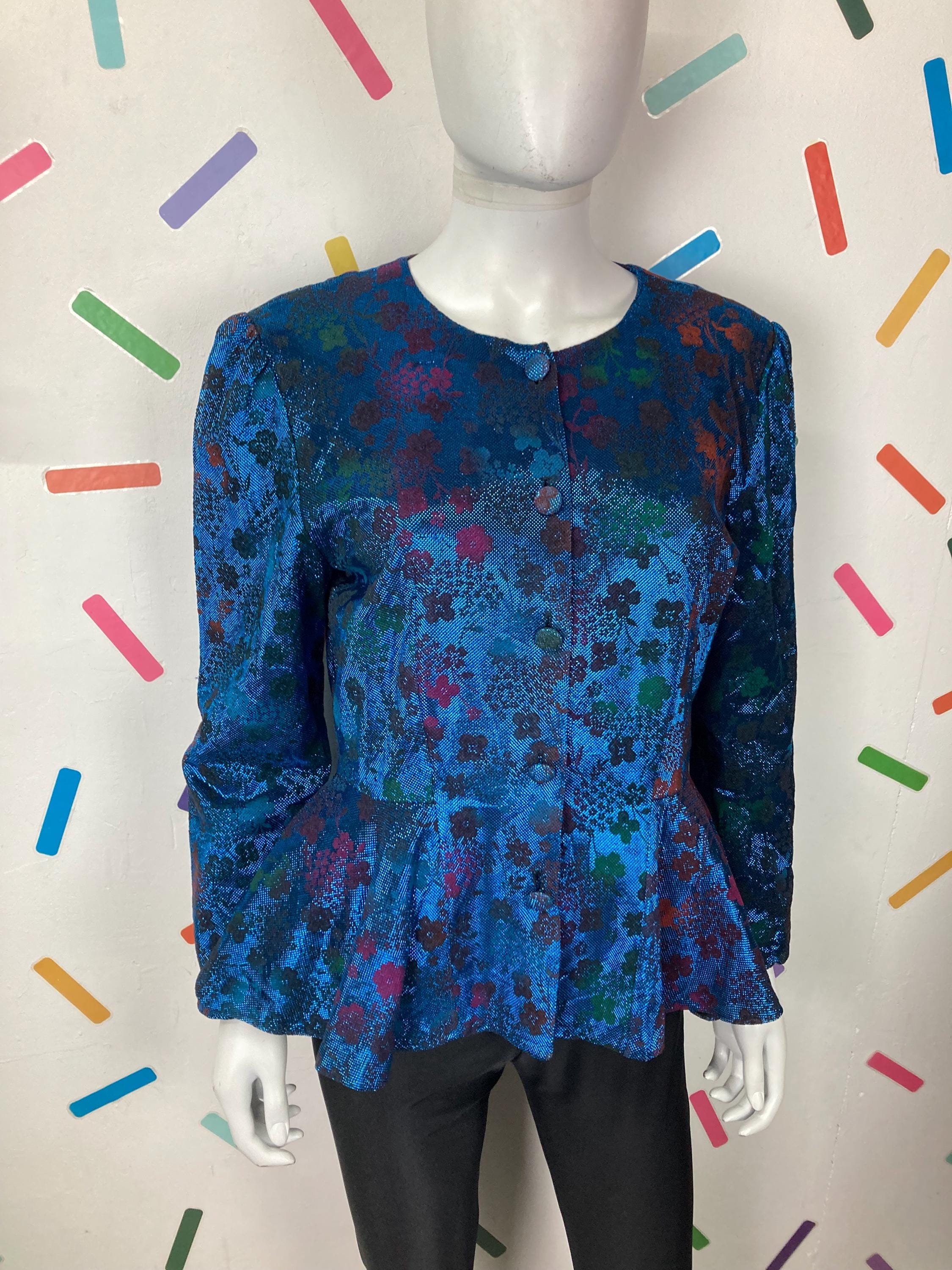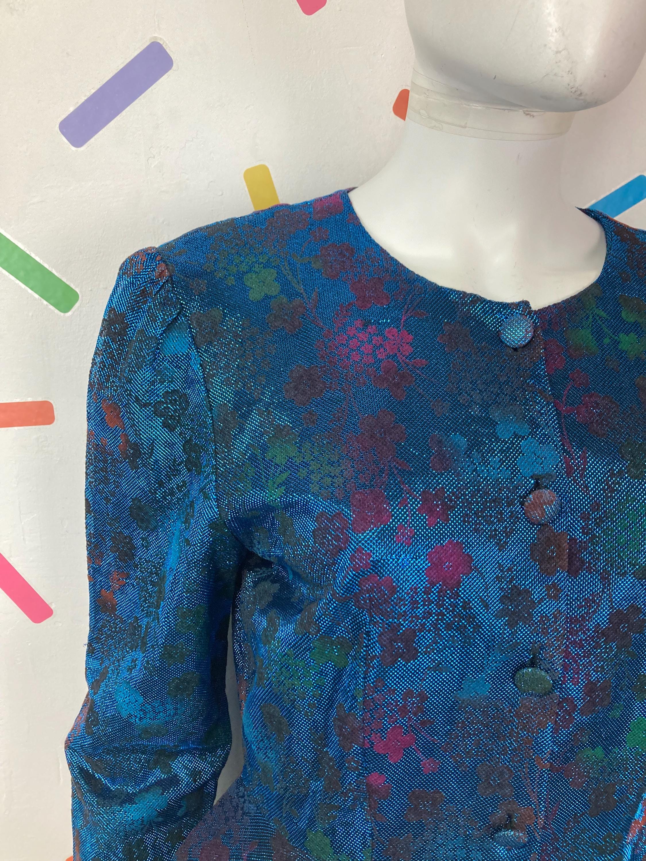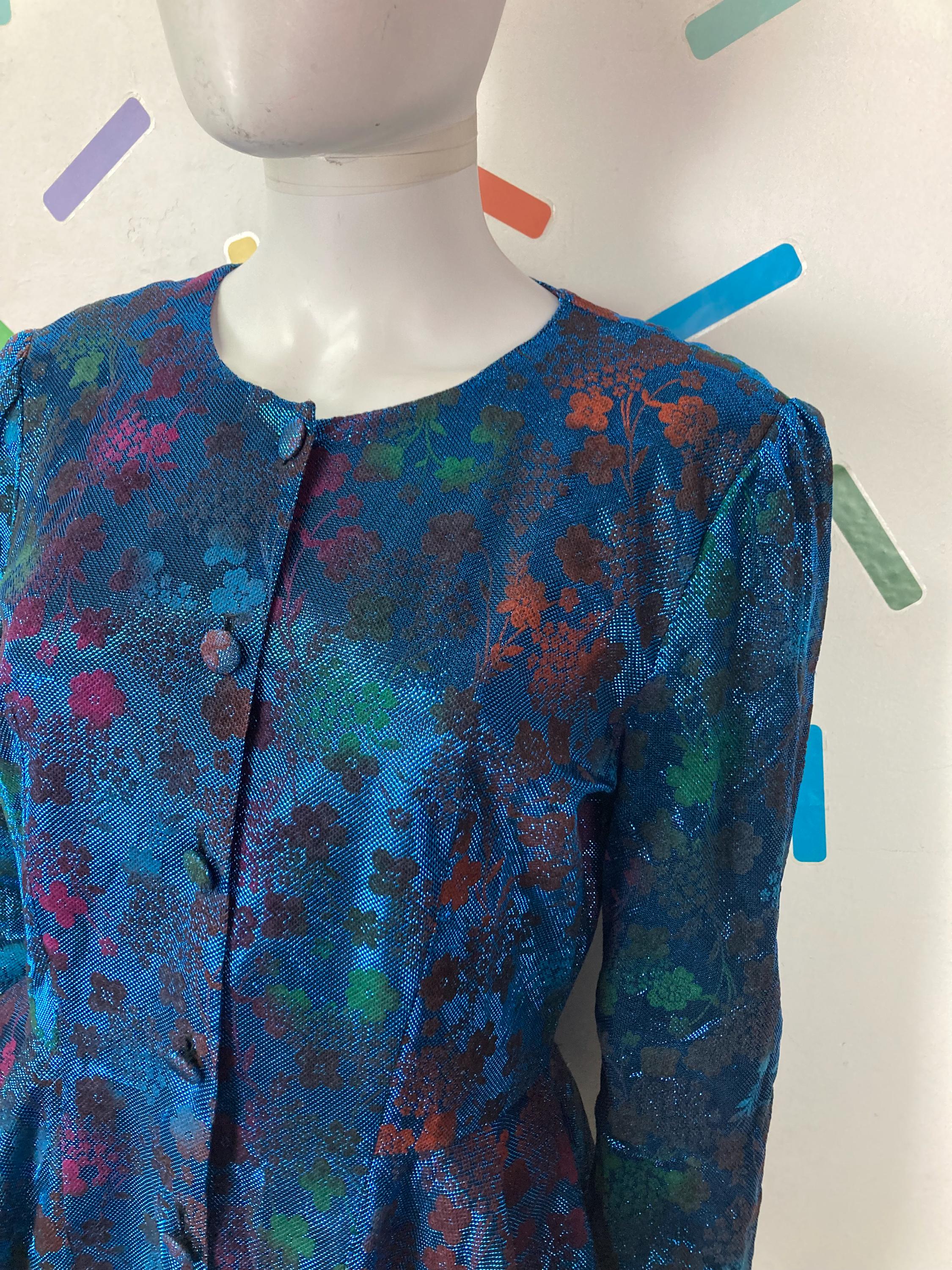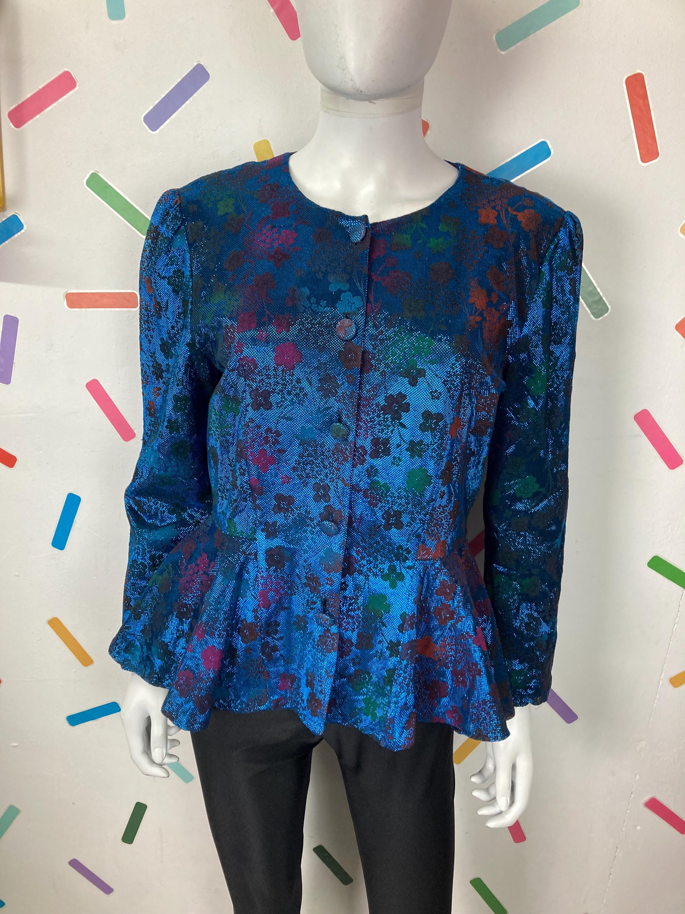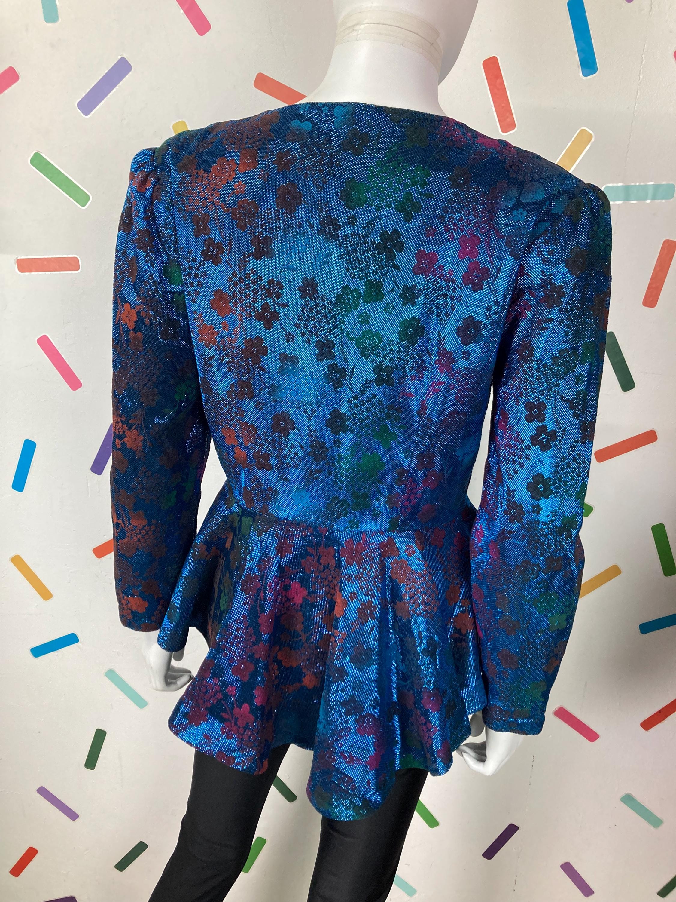 Other: This is a fabulous 80s blue lightweight metallic floral design peplum top with button fastening.