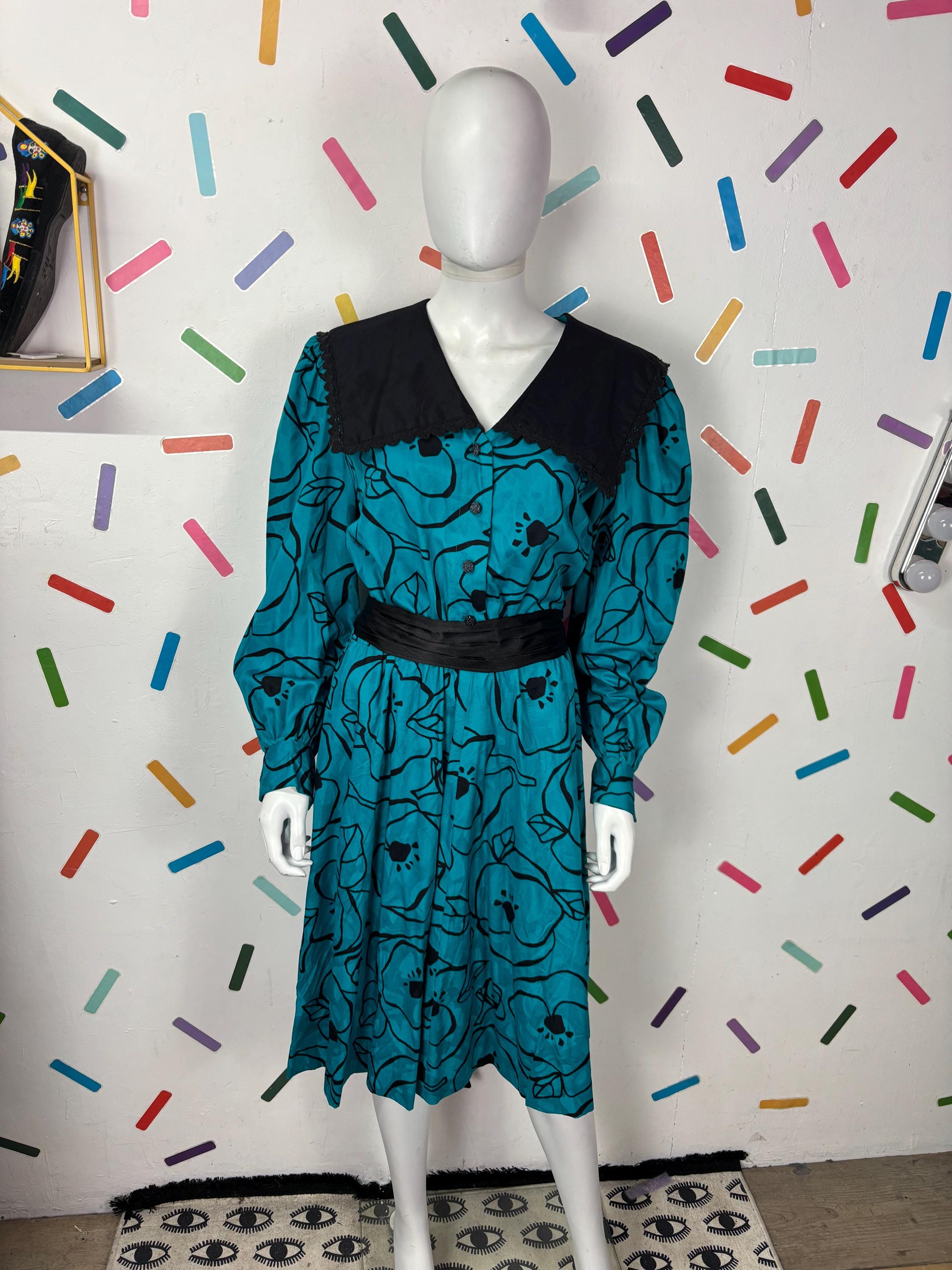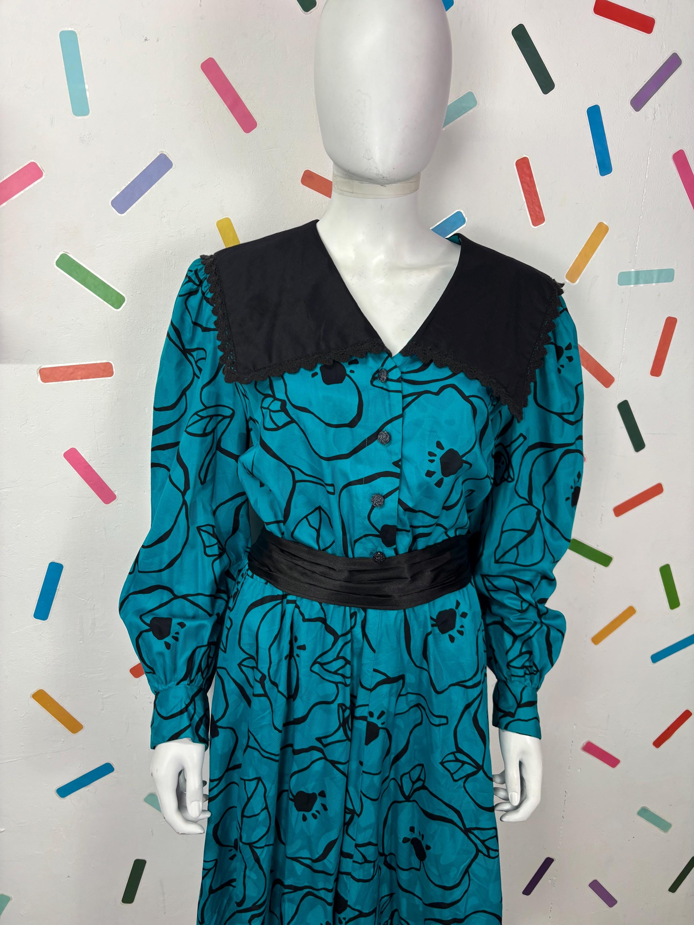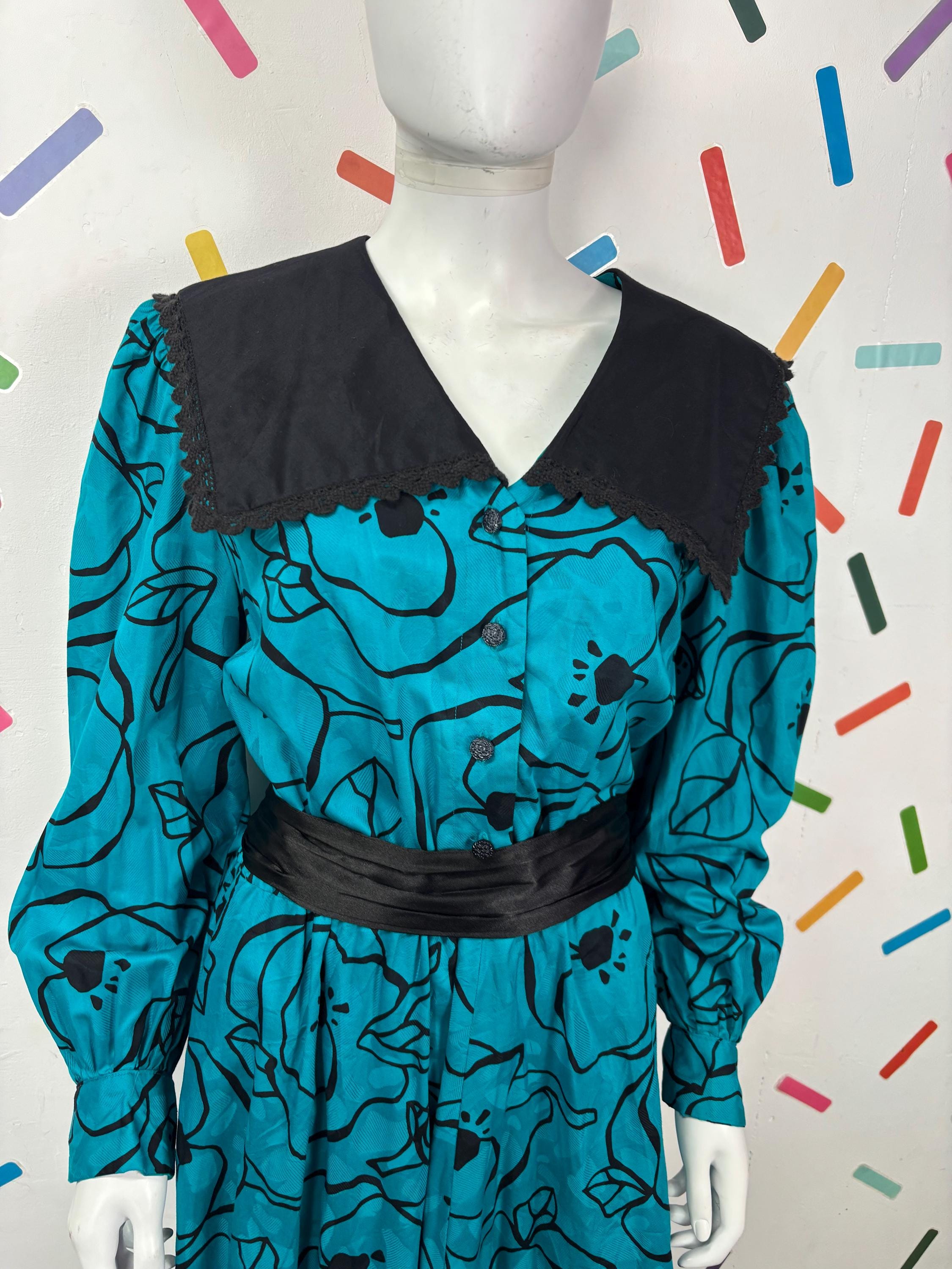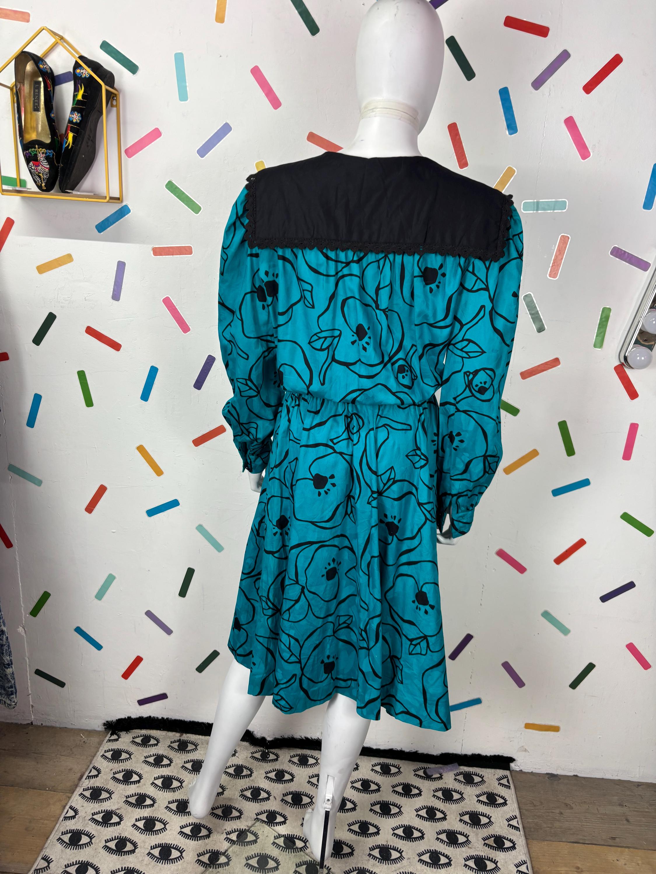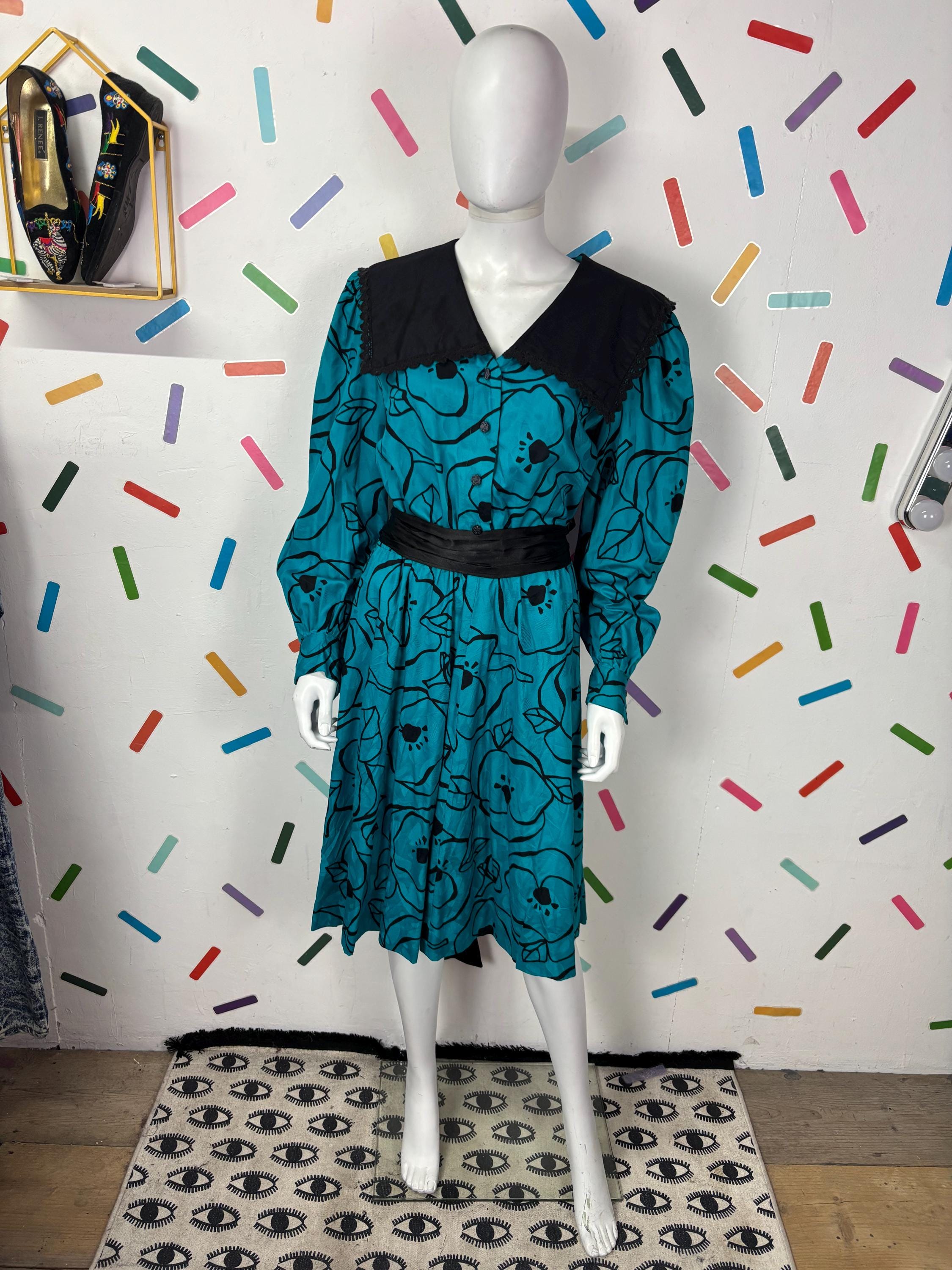 Other: This is a fabulous 80s does 50s teal and black midi dress with abstract design and collar detail.