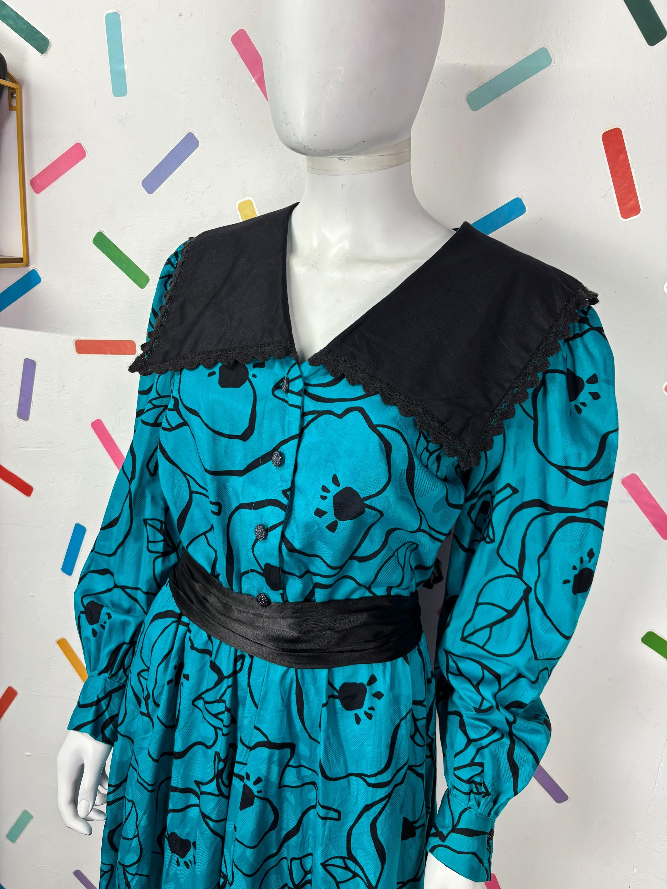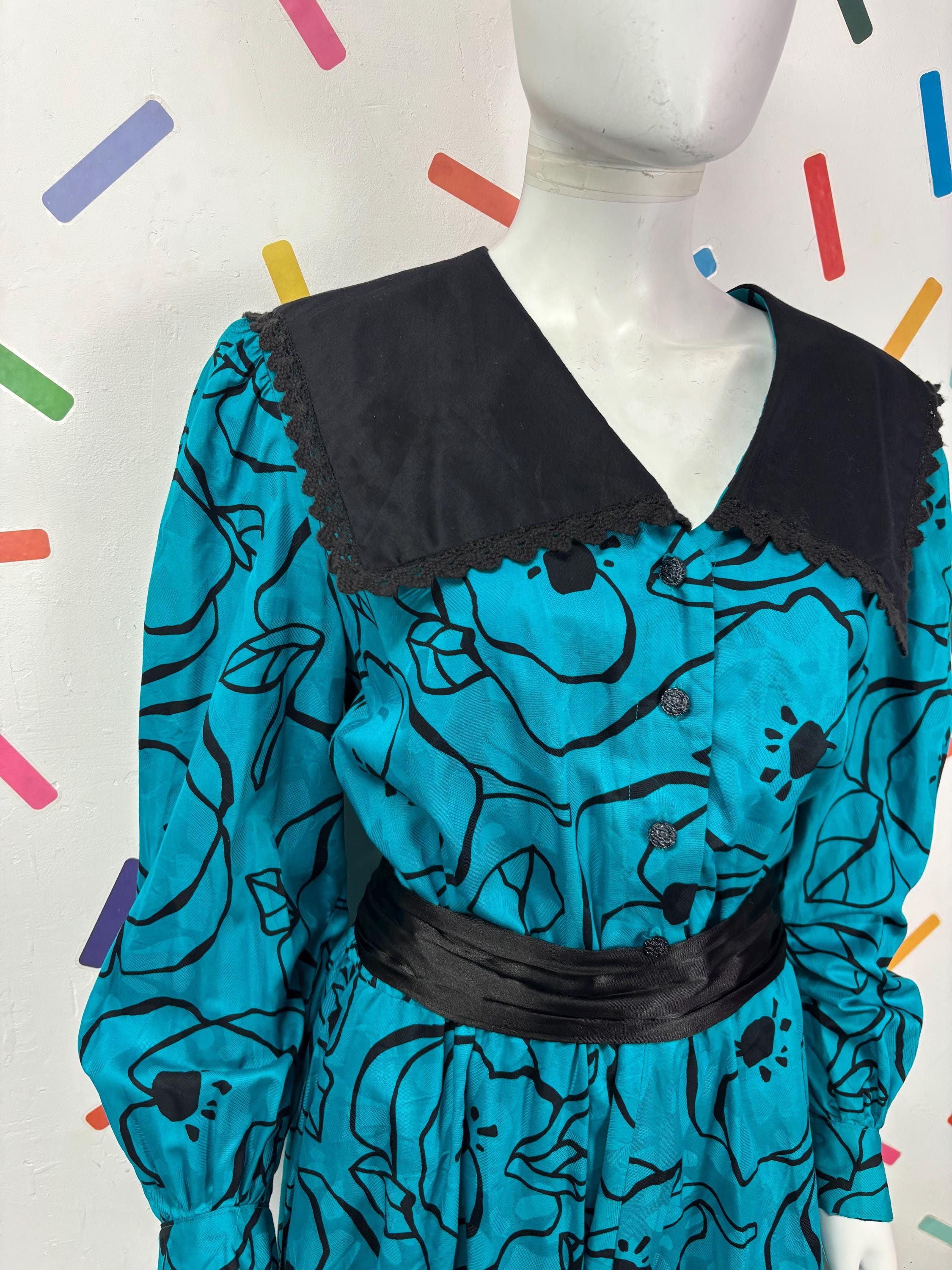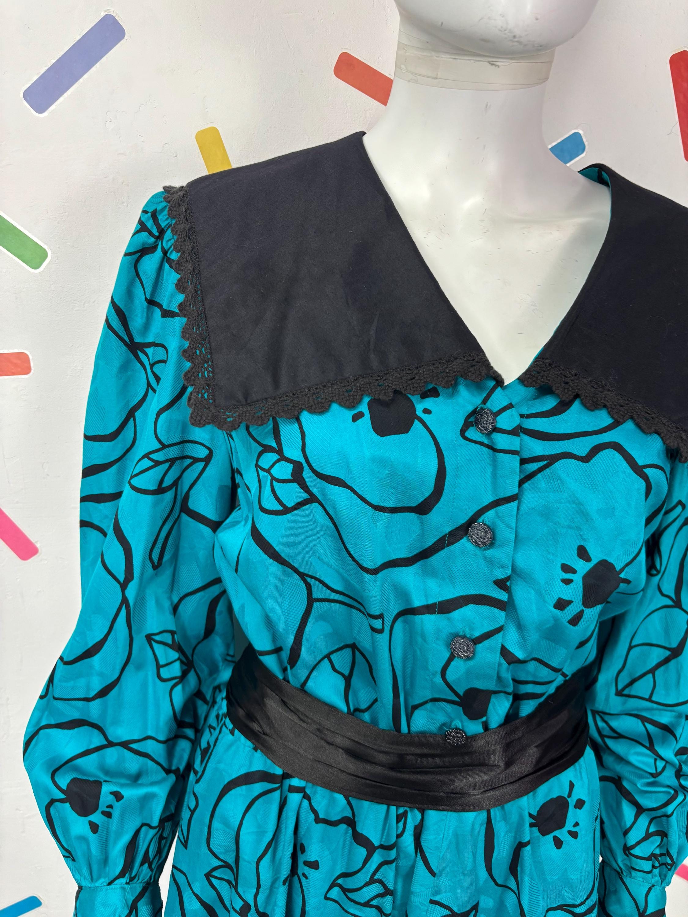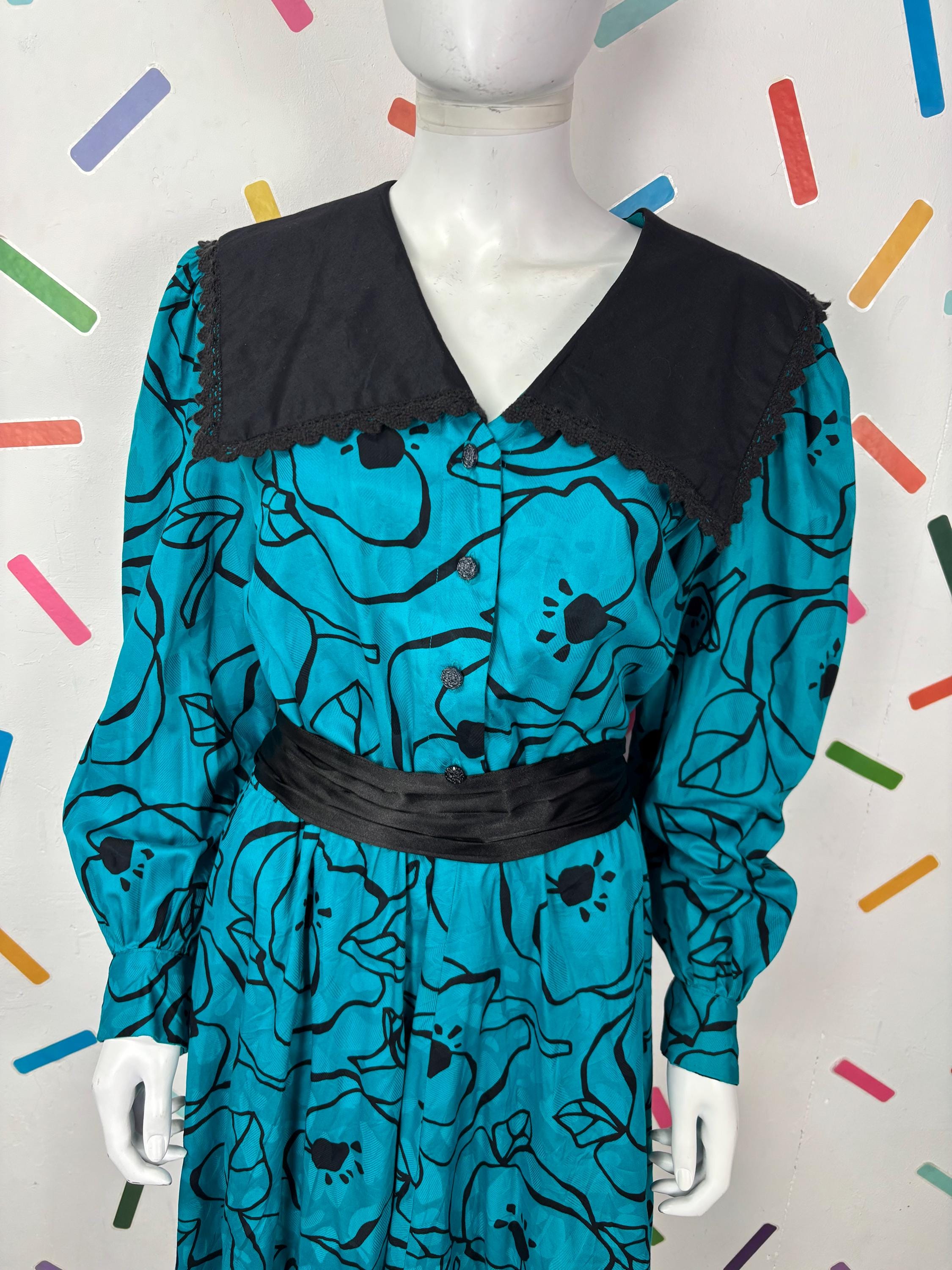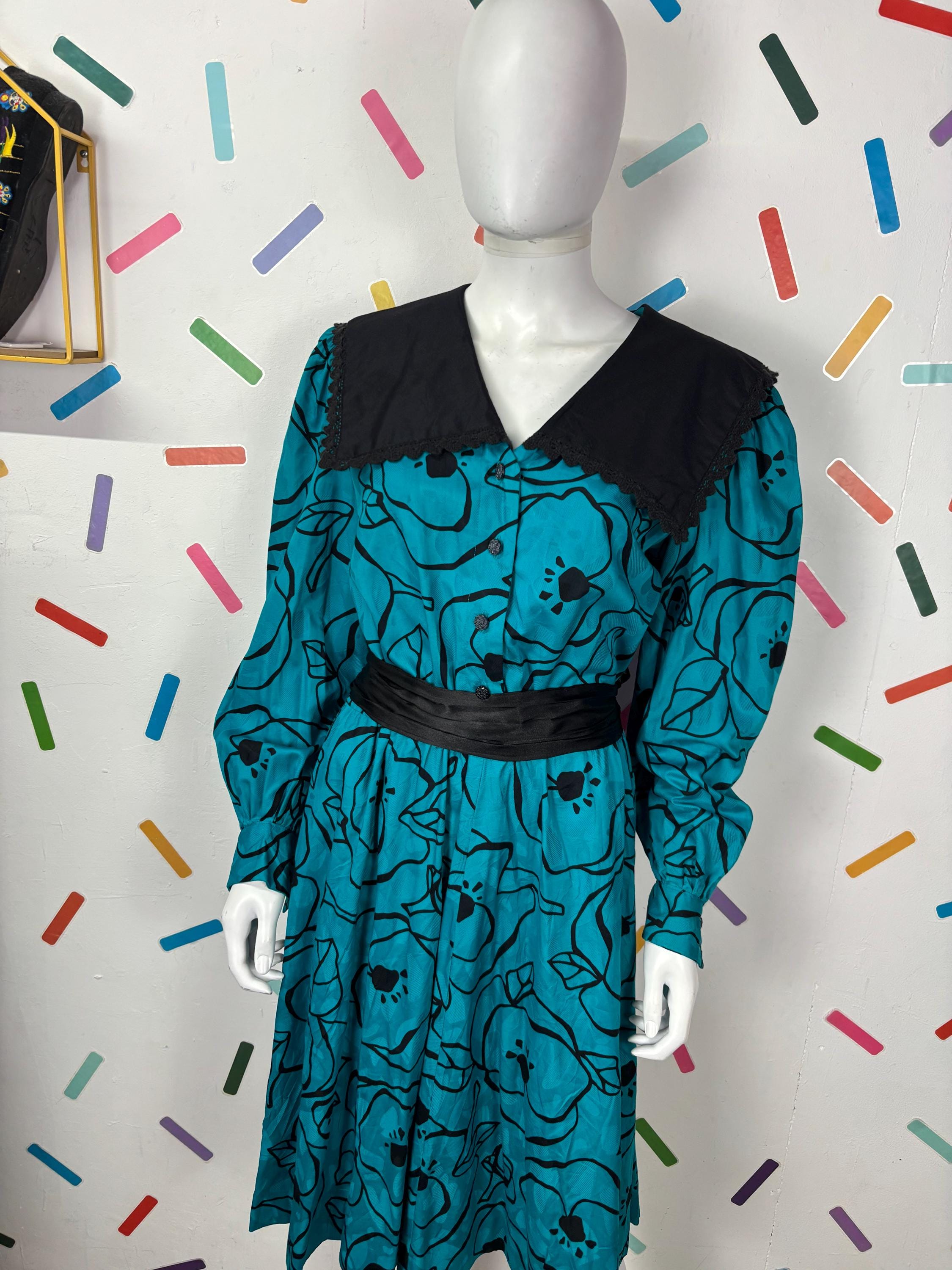 Other: This is a fabulous 80s does 50s teal and black midi dress with abstract design and collar detail.